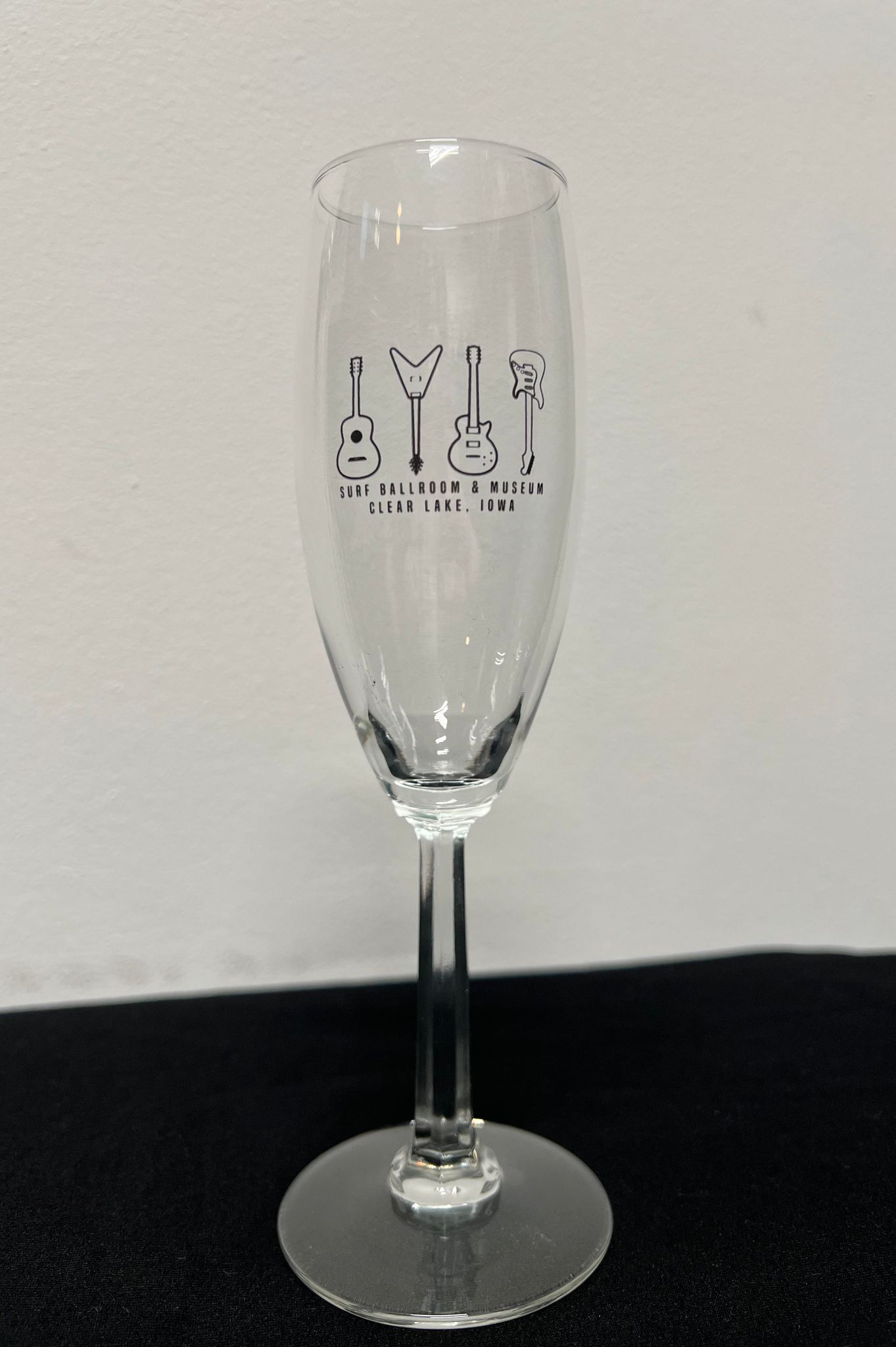 Choose from: Champagne or a Wine Glass Our support live music guitars logo printed on Glass in black "Surf Ballroom & Museum Clear Lake, Iowa"